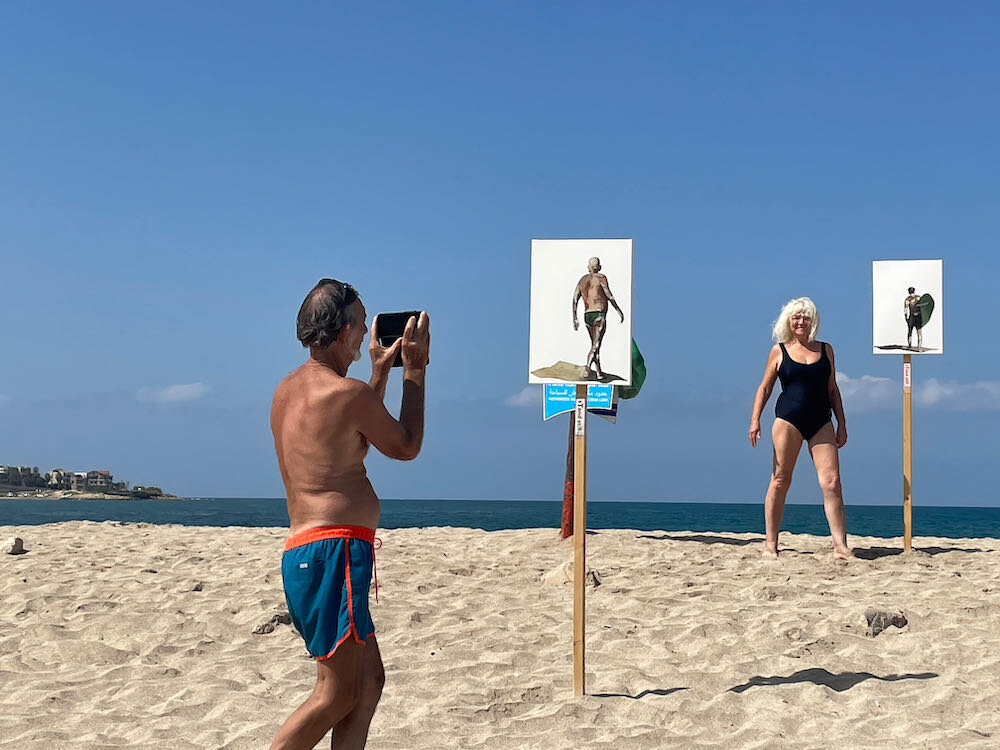 Art installation on Israel shoreline. 20 painted figures on the beach captured at a given moment.